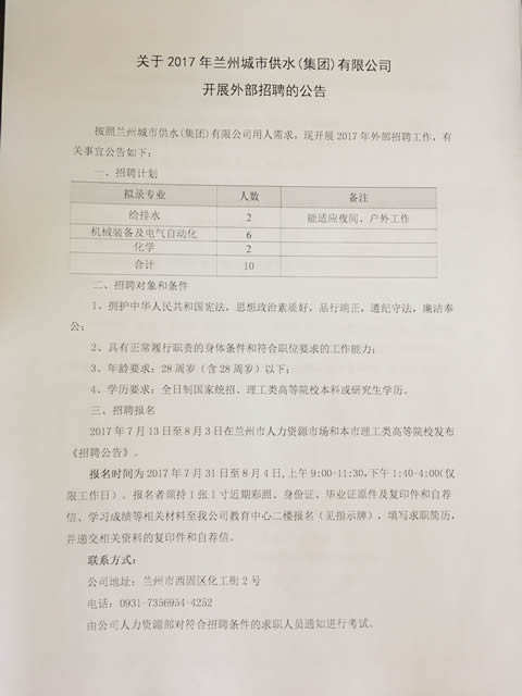 關(guān)于2017年蘭州城市供水(集團(tuán))有限公司開(kāi)展外部招聘的公告