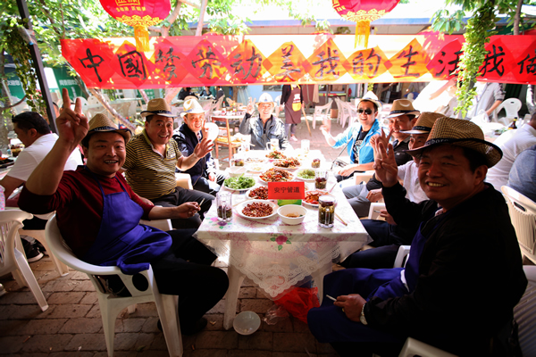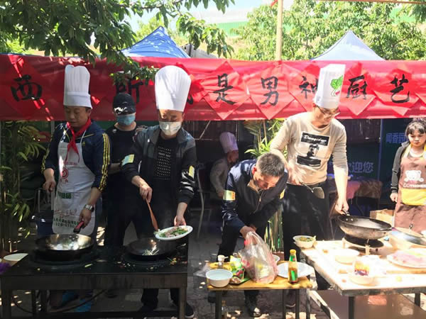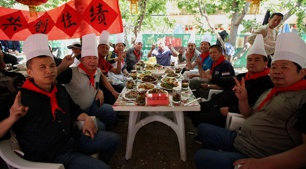 他們或者三兩成團(tuán)張羅,或者獨(dú)自穿行忙碌,配菜的配菜,炒菜的炒菜,擺放的排放……花香、菜香,歡笑聲、音樂聲交織在一起,使大家忘記了年齡,忘記了煩惱,忘記了疲勞。其中有90后員工此生第一次炒出來的土豆絲,也有煎、炒、烹、炸廚藝行云流水般的展現(xiàn)。一盤盤色彩繽紛,造型別致的菜品陸續(xù)擺放上桌,有醬香誘人的全肘,創(chuàng)意可佳的菠蘿燉排骨,有大顯刀工的三絲和青豆抱蝦仁,也有民族風(fēng)味地道的黃燜羊肉,干鍋土豆片……。