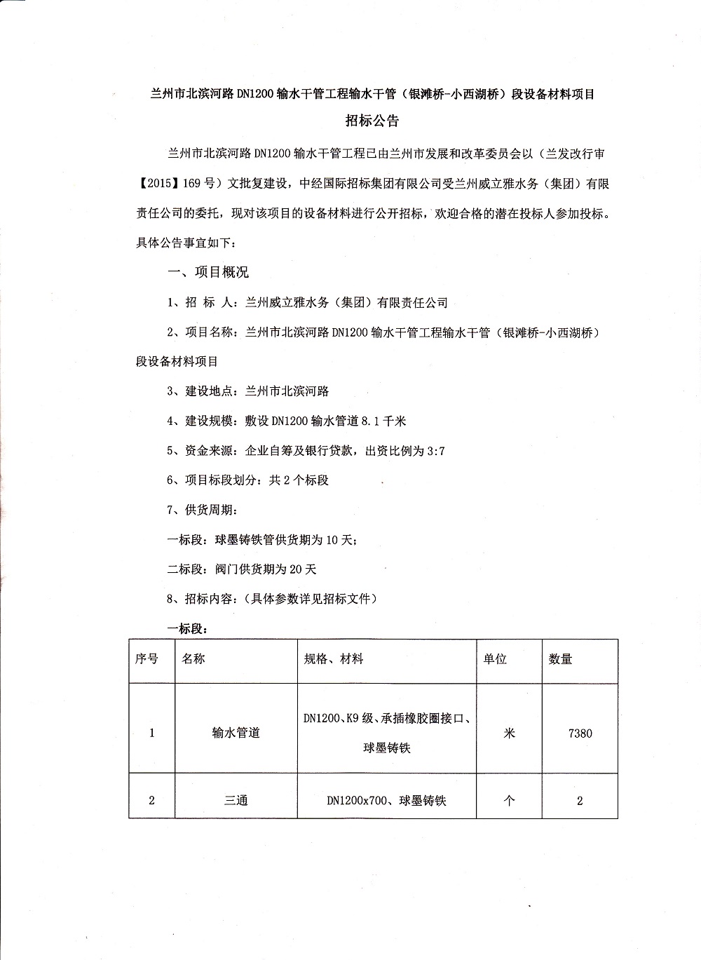 蘭州市北濱河路DN1200輸水干管工程輸水干管(銀灘橋-小西湖橋)段設(shè)備材料項(xiàng)目招標(biāo)公告