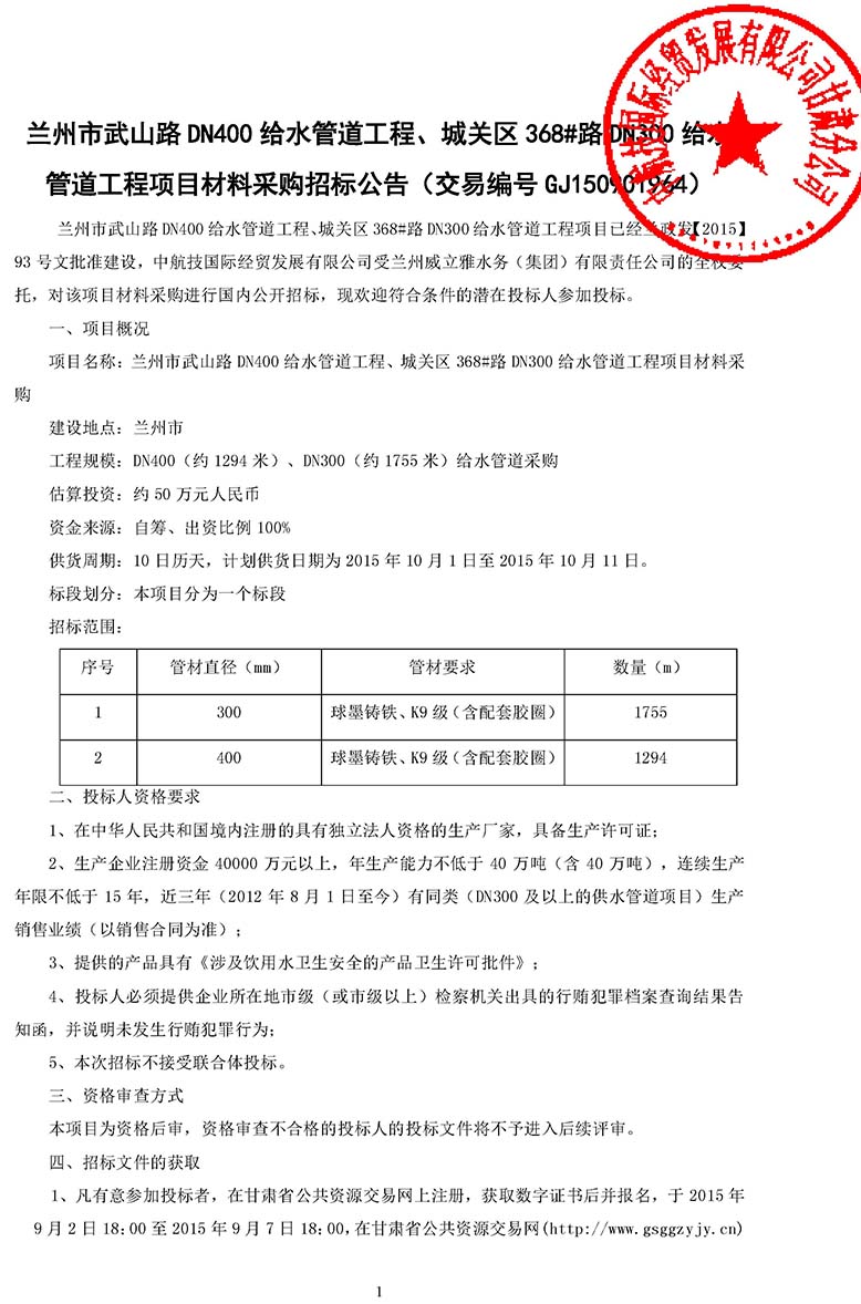 蘭州市廣河路DN225給水管道工程、武山路DN400給水管道工程、城關(guān)區(qū)368#路DN300給水管道工程項(xiàng)目材料采購(gòu)招標(biāo)公告